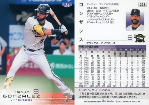 Nombre comercial en japonés: BBM/レギュラーカード/1stバージョンアップデート版/BBM2023 ベースボールカード 2ndバージョン 338[レギュラーカード]:ゴンザレス