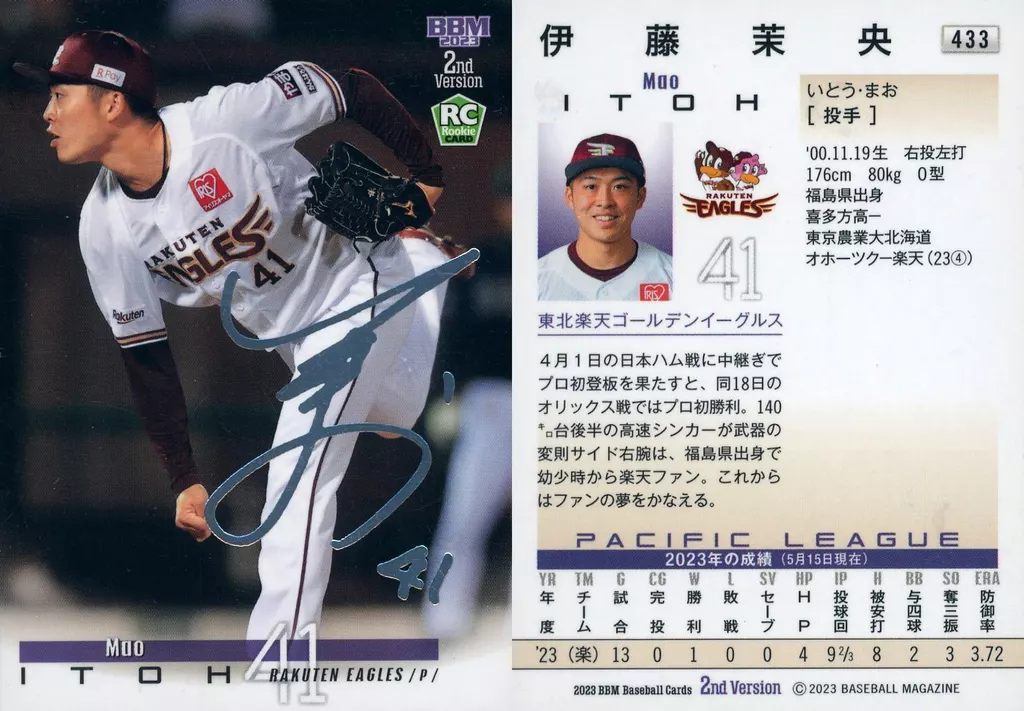Nombre comercial en japonés: BBM/レギュラーカード/ROOKIE/BBM2023 ベースボールカード 2ndバージョン 433[レギュラーカード]:伊藤茉央(銀箔押しサイン入り)