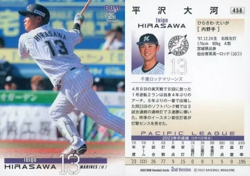 Nombre comercial en japonés: BBM/レギュラーカード/BBM2023 ベースボールカード 2ndバージョン 458[レギュラーカード]:平沢大河