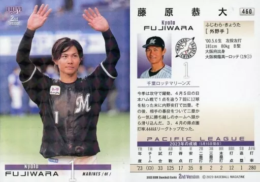 Nombre comercial en japonés: BBM/レギュラーカード/BBM2023 ベースボールカード 2ndバージョン 460[レギュラーカード]:藤原恭大(キラカード版)