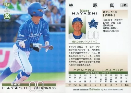 Nombre comercial en japonés: BBM/レギュラーカード/ROOKIE/BBM2023 ベースボールカード 2ndバージョン 509[レギュラーカード]:林琢真(キラカード版)