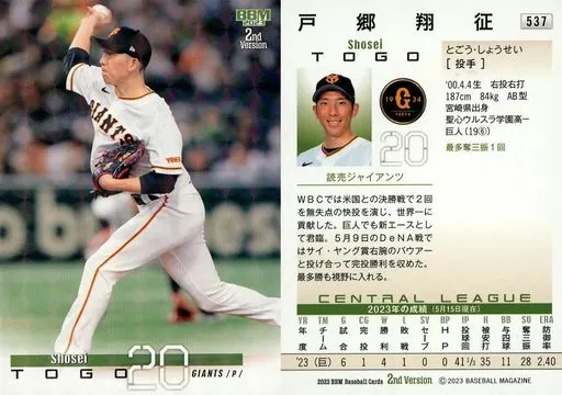 Nombre comercial en japonés: BBM/レギュラーカード/BBM2023 ベースボールカード 2ndバージョン 537[レギュラーカード]:戸郷翔征(キラカード版)