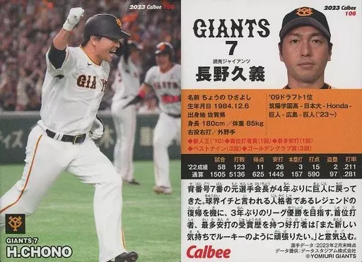 Nombre comercial en japonés: スポーツ/レギュラーカード/巨人/2023プロ野球チップス 第2弾 106[レギュラーカード]:長野久義