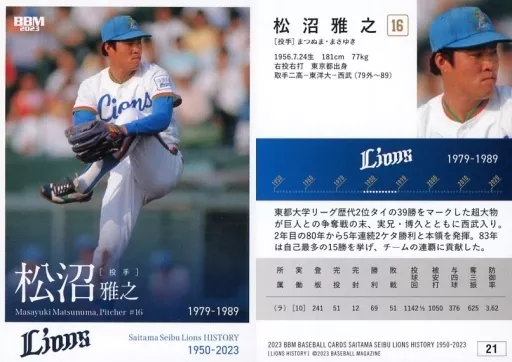 Nombre comercial en japonés: BBM/レギュラーカード/球団OB/BBM2023 埼玉西武ライオンズヒストリー1950-2023 21[レギュラーカード]:松沼雅之