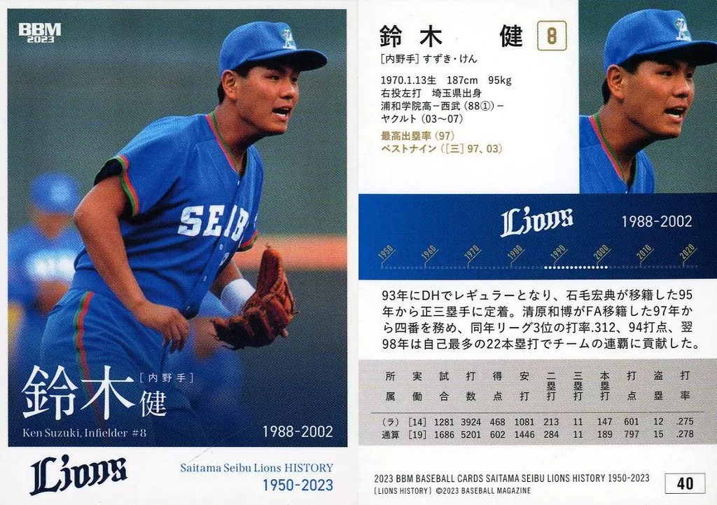 Nombre comercial en japonés: BBM/レギュラーカード/球団OB/BBM2023 埼玉西武ライオンズヒストリー1950-2023 40[レギュラーカード]:鈴木健