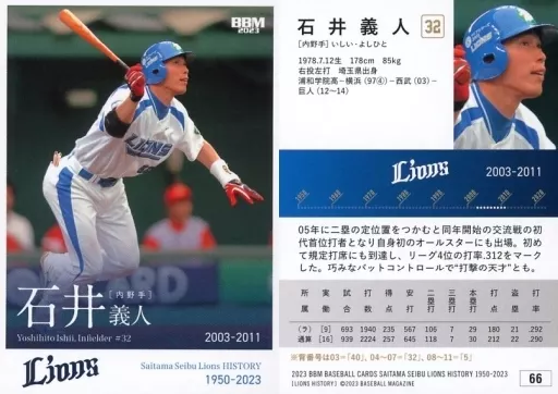 Nombre comercial en japonés: BBM/レギュラーカード/球団OB/BBM2023 埼玉西武ライオンズヒストリー1950-2023 66[レギュラーカード]:石井義人