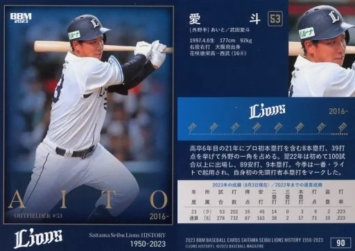 Nombre comercial en japonés: BBM/レギュラーカード/現役選手/BBM2023 埼玉西武ライオンズヒストリー1950-2023 90[レギュラーカード]:愛斗
