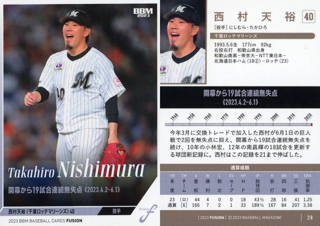 Nombre comercial en japonés: BBM/レギュラーカード/記録の殿堂/BBM2023 FUSION 28[レギュラーカード]:西村天裕(シークレット版)