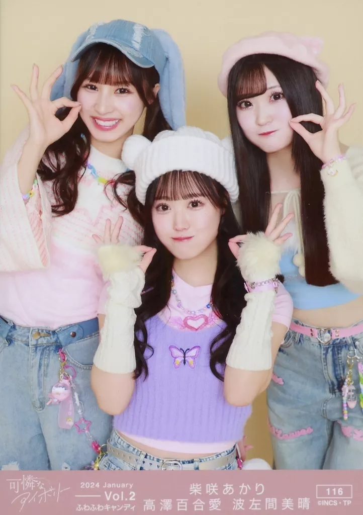 Nombre comercial en japonés: 生写真(女性)/アイドル/可憐なアイボリー 116:ふわふわキャンディ/柴咲あかり・高澤百合愛・波左間美晴/生写真セット January Vol.2