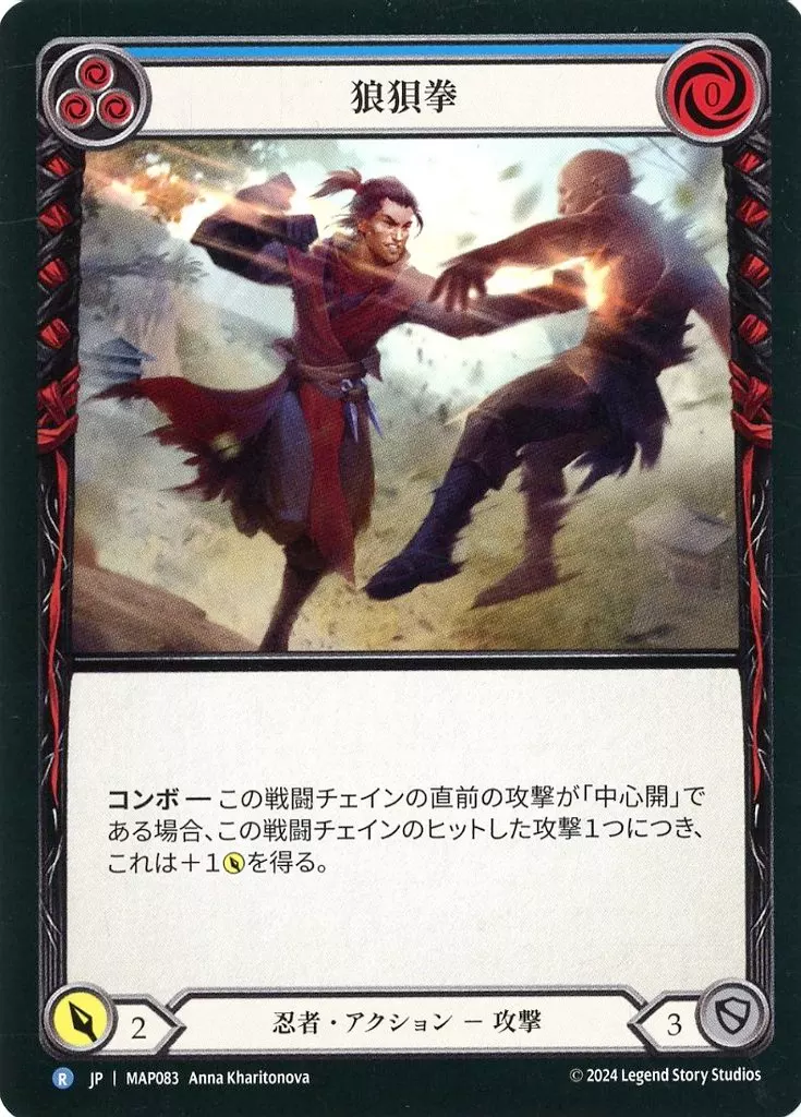 Nombre comercial en japonés: Flesh and Blood/R/忍者/日本語版/霧隠の秘境(Part the Mistveil):アーカイブパック MAP083[R]:狼狽拳 (3)/Fluster Fist (3)