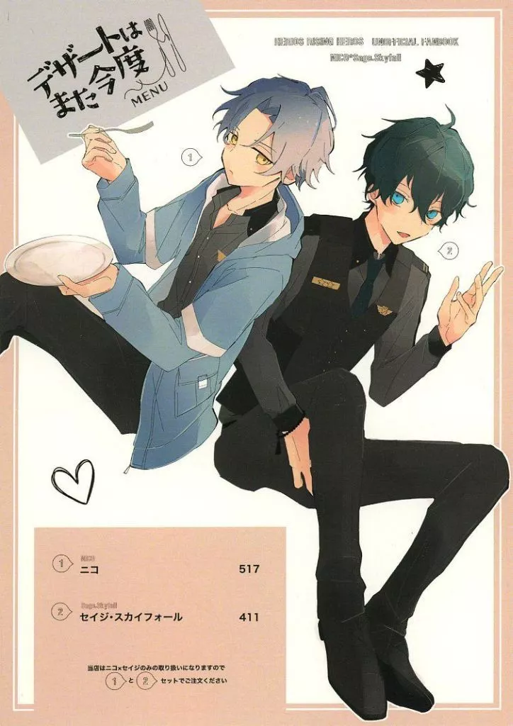 Nombre comercial en japonés: 女性向け一般同人誌(BL含む) エリオスライジングヒーローズ デザートはまた今度 / りー ニコ×セイジ