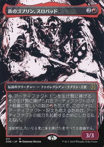 Nombre comercial en japonés: マジックザギャザリング/日本語版/R/赤/ファイレクシア:完全なる統一 311[R]:【ONE】【ボーダーレス胆液版】鉄のゴブリン、スロバッド/Slobad Iron Goblin