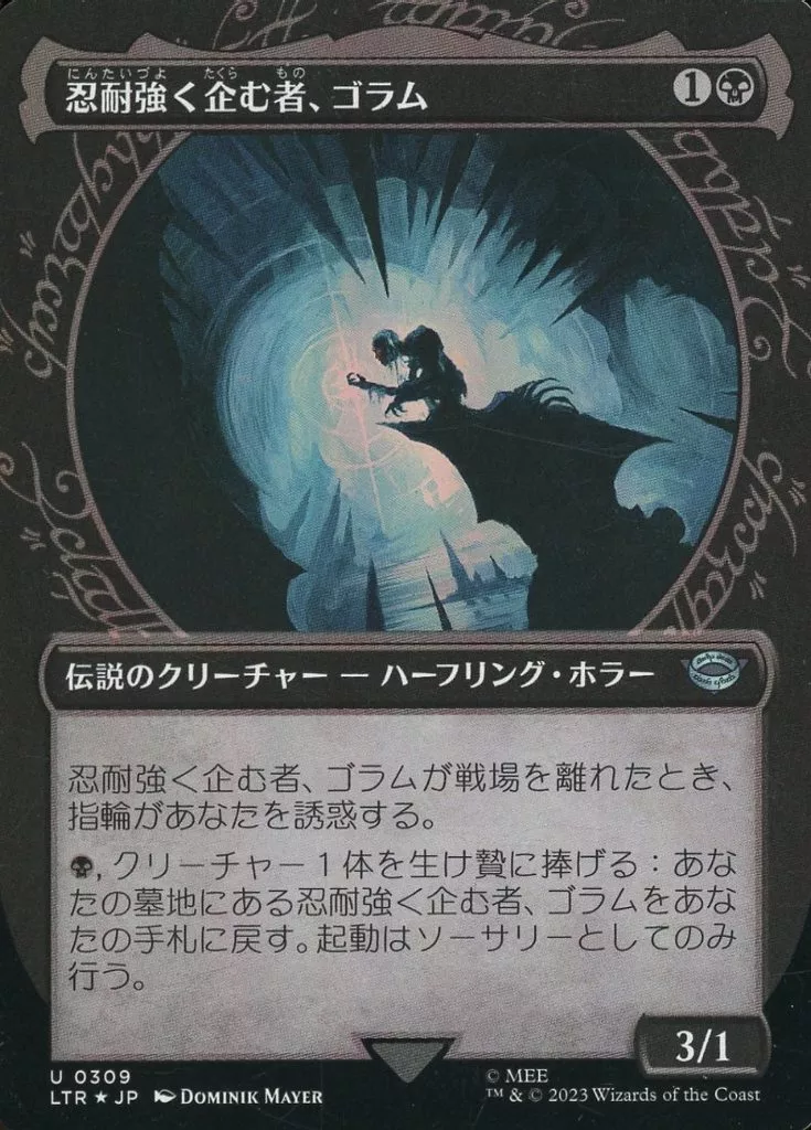 Nombre comercial en japonés: マジックザギャザリング/日本語版FOIL/U/黒/指輪物語:中つ国の伝承 0309[U]:【LTR】【FOIL】【指輪フレーム版】忍耐強く企む者、ゴラム/Gollum Patient Plotter