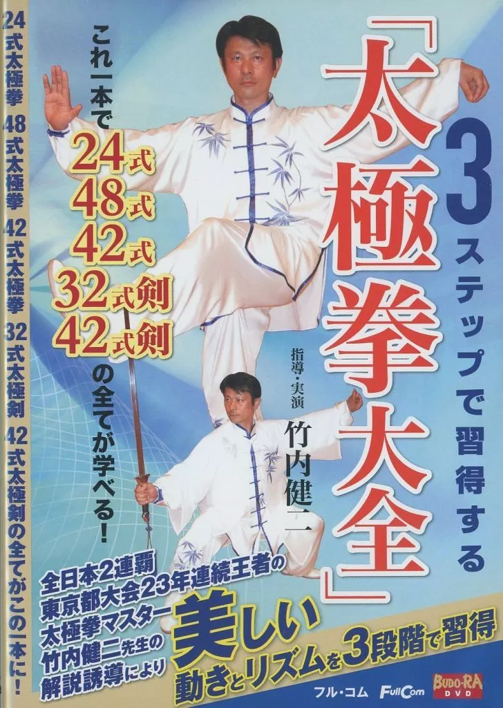 【収録時間】123分【画面サイズ】ワイド【出演者一覧】指導・実演・出演:竹内健二【枚数】1 枚【映像コメント】全日本2連覇の太極拳マスター、竹内健二による指導作品。美しき動きとリズムを3段階で習得できるようなプログラムになっており、24式、48式、42式、42式剣、32式剣というすべての太極拳がこれで学べる。【製作国名】日