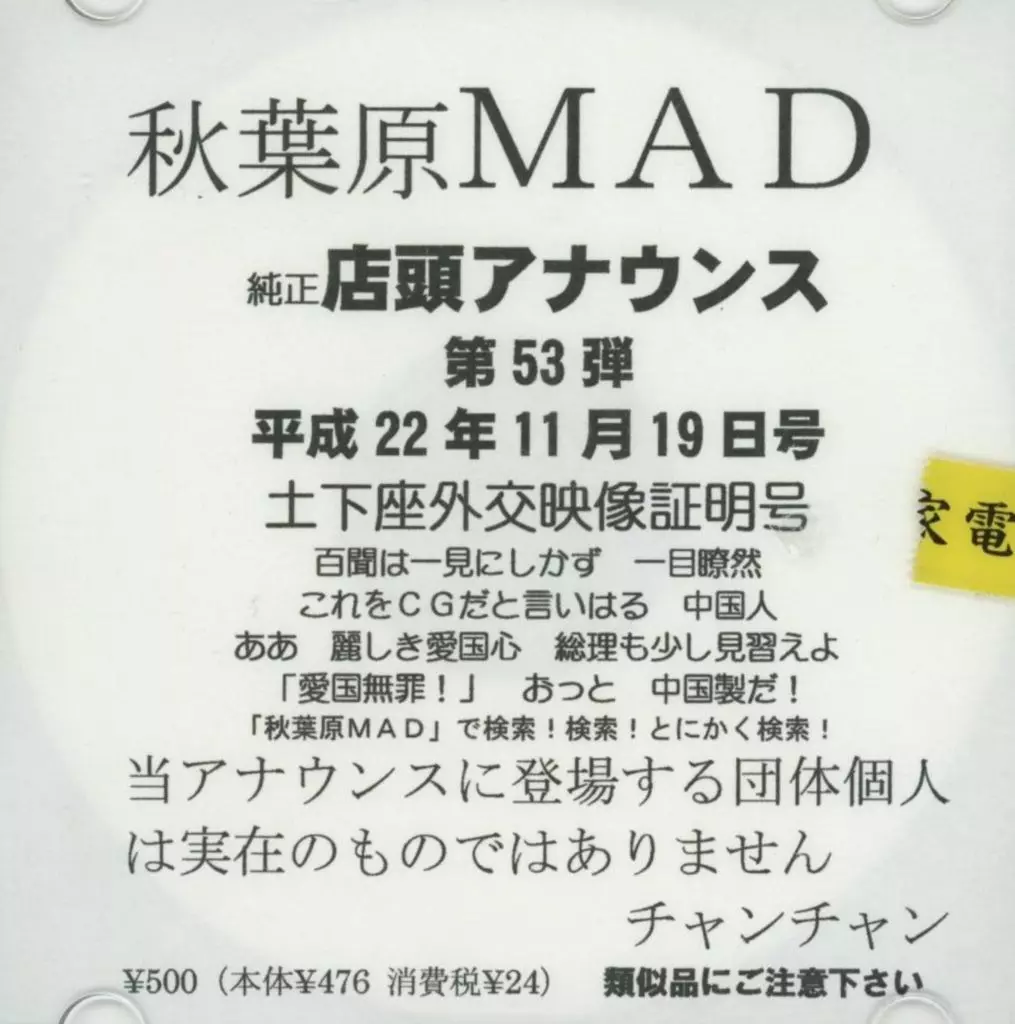 同人音楽CDソフト 秋葉原MAD 純正店頭アナウンス 第53弾 平成22年11月19日号 土下座外交映像証明号 / 秋葉原MAD