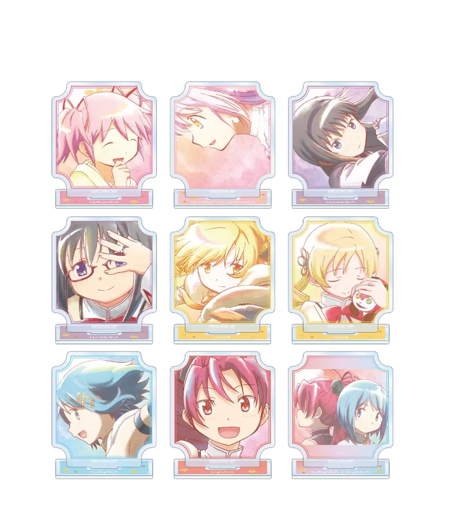 鹿目まどか、アルティメットまどか、暁美ほむら、巴マミ、美樹さやか、佐倉杏子のイラストを新たなタッチで魅力的に表現し、アクリルスタンドに仕上げました。