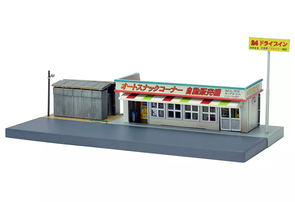商品解説■出入り口(2か所):パーツの脱着選択式(画像では左側を解放)目隠し小屋:雑誌自販機6台と外灯付属道路:別パーツ構造(建物、小屋、道路の3ピースに分離します)自販機は単独でも使えます。 【商品詳細】<セット内容>建物(自販機x6)、目隠し小屋(自販機x6)、道路、大型看板、外灯、ごみ箱、シールサイズ:約W14×D7×H6cm