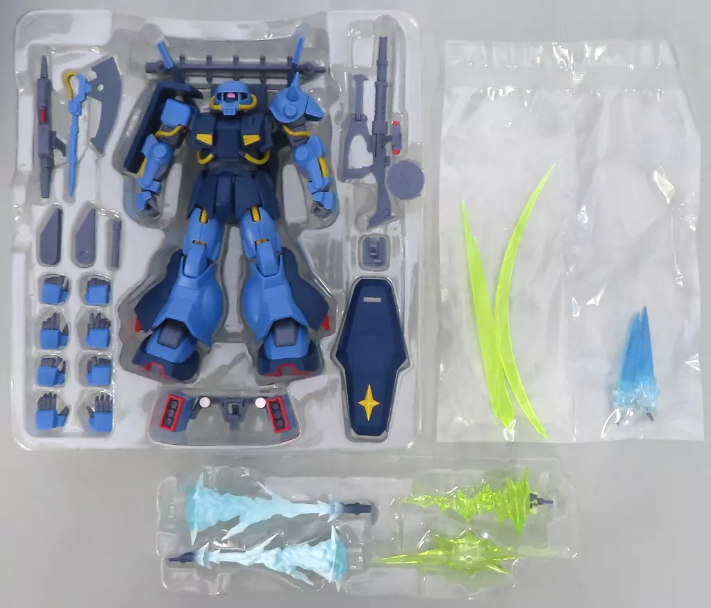 フィギュア本体、交換用手首(左右各4)、ビーム・サーベル柄×1、ビーム・サーベル刃(通常・湾曲各1)、ヒート・ホーク、ビーム・ライフル、ビームエフェクト、ミサイル・ポッド、ミサイル・ポッドエフェクト×2、武器マウント、120mmザク・マシンガン改、マガジン、マシンガン発射エフェクト(A・B各1)、シールド、予備カードリッジ×2、バーニアアフェクト(曲)×2、手首格納デッキ、説明書