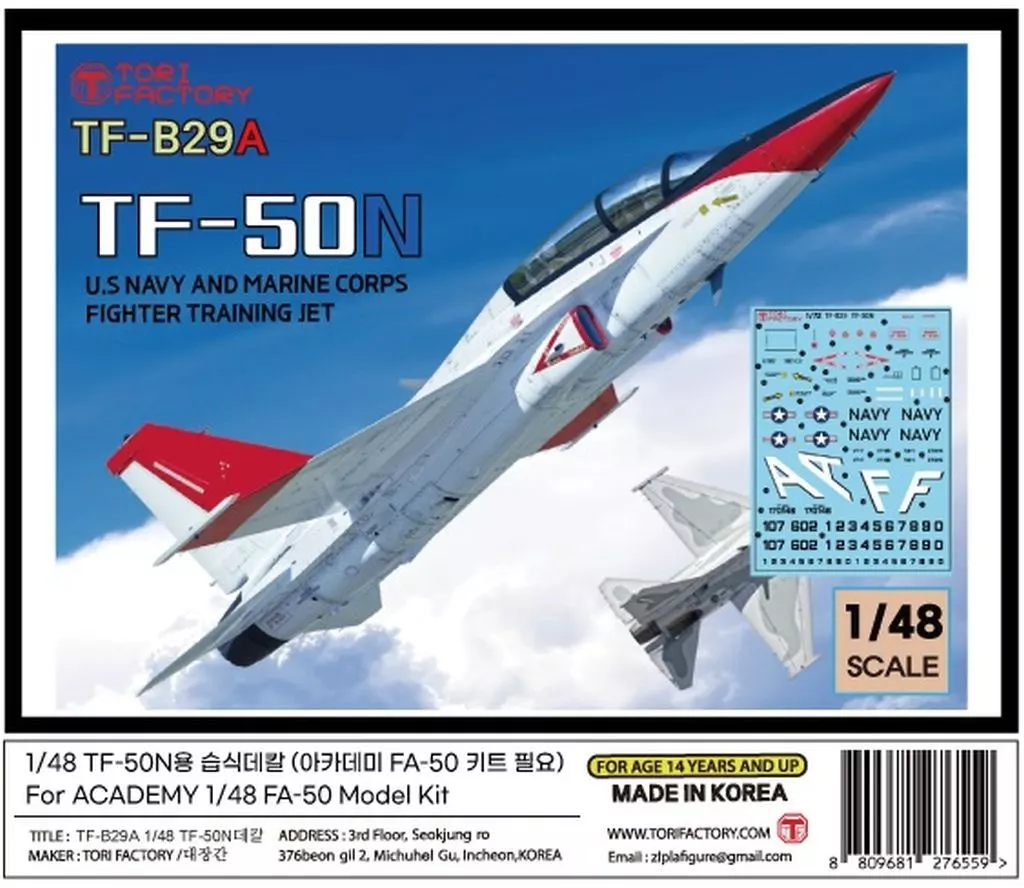 韓国空軍のFA-50軽攻撃機を、アメリカ海軍が練習機として採用したという設定の仮想機「TF-50N」を再現するデカールセットです。アカデミー製FA-50キットに対応します。