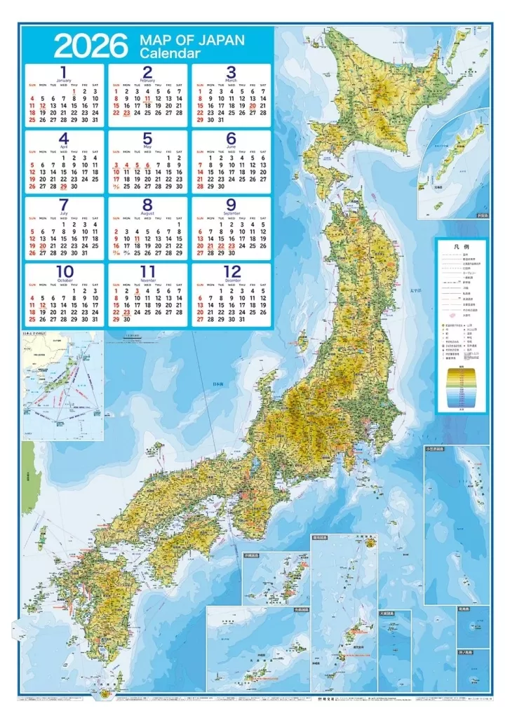 商品解説■大判の日本全図カレンダー。パッと見て分かる地形表現や豊富な地名表記によって日本のカタチがよく分かる昭文社の日本全図に、カレンダーを合わせています。大判なので、インテリアに最適です。壁に貼っておけば、旅行の計画や、ニュースで気になった場所をすぐに探したいときなどにも役立ちます。表面をコーティングしているため、丈夫で汚れに強く、1年間の使用にも問題なく耐えられます。【商品詳細】サイズ:約88×62.5cm仕様:1枚