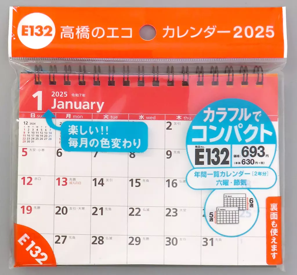 商品解説■エコで地球にやさしい、シンプルな卓上タイプのカレンダー[A6サイズ]毎月色が変わるカラフルでコンパクトな卓上カレンダー。ポップな色使いながらスマートなデザインが人気です。シンプルでスマートなデザインが人気のコンパクトカレンダー。裏面も使い勝手が抜群です。デスクを彩るミニサイズカレンダー。数字が見やすく、予定を書き込みやすいデザインです。【商品詳細】サイズ:A6仕様:13枚組、卓上型