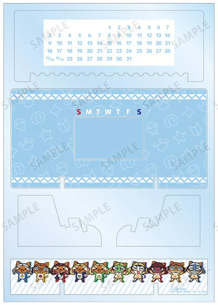 ケロロアイルー、タママアイルー、ギロロアイルー、クルルアイルー、ドロロアイルー、ケロロ、タママ、ギロロ、クルル、ドロロのイラストを卓上アクリル万年カレンダーに仕上げました。
