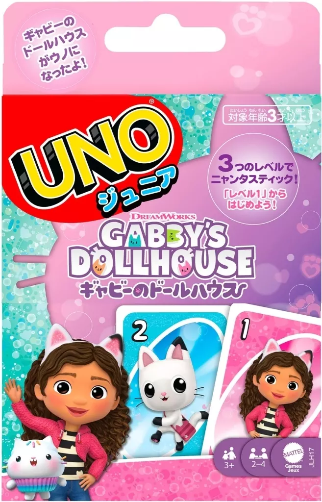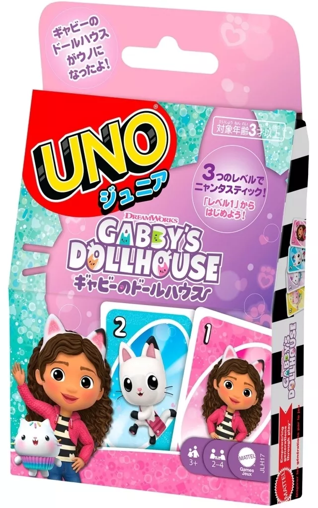 商品解説■簡単ルールで遊べるウノジュニアから、ギャビーのドールハウスとコラボした商品が登場!小さなお子さまが初めて“ルール”のある遊びをしたり、数字や色を遊びながら学べる学習ツールとしても最適です。レベル1:キャラクターと数字を合わせてカードを出すレベル2:リバース・スキップ・ワイルドも追加して遊んでみるレベル3:ドロー1、ドロー2も追加して遊ぶ。【商品詳細】対象年齢:3歳以上
