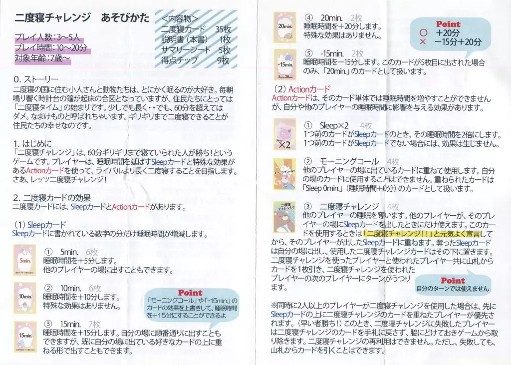 商品詳細■サークル「じゃこ部」から頒布された「二度寝チャレンジ」です。こちらは「ゲームマーケット2019秋」で頒布された商品です。■ゲーム概略■プレイ人数:3~5人対象年齢:7歳以上プレイ時間:10~20分デザイナー:じゃこ部<内容物>二度寝カード 35枚サマリーシート 5枚得点チップ 9枚取扱説明書 1部
