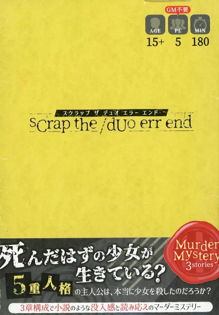 商品解説■「死んだはずの少女が生きている?」3つのストーリーで謎を解き明かそう!こちらは「ゲームマーケット2021大阪」に頒布された商品です。■ゲーム概略■プレイ人数:5人プレイ時間:約180分対象年齢:15歳以上デザイナー:大阪人狼ラボ 村長<内容物>非公開情報シート 15枚endシート 5枚シナリオブック 5冊捜査カード 15枚ポイント集計表 1枚取扱説明書 1部