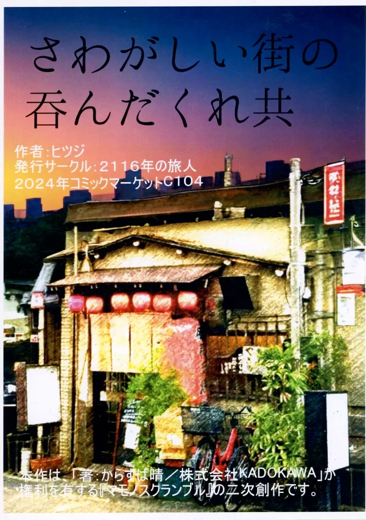 商品解説■サークル「2116年の旅人」による「シナリオ さわがしい街の?んだくれ共」です。こちらは「コミックマーケット104(コミケ104/2024夏)」に頒布された商品です。【商品詳細】システム:マモノスクランブル仕様:28ページ/B5サイズ著者:ヒツジ
