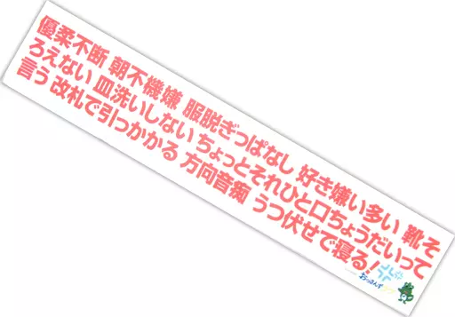 商品解説■ドラマ「おっさんずラブ」の公式グッズです。珠玉の名言がデザインされたマフラータオルが登場!それぞれの名言が大きくプリントされ、ワンポイントでてんくぅんもデザインされています。【商品詳細】名言:優柔不断 朝不機嫌 服脱ぎっぱなし 好き嫌い多い 靴そろえない 皿洗いしない ちょっとそれひと口ちょうだいって言う 改札で引っかかる 方向音痴 うつ伏せで寝る!サイズ:約H200×W1200mm素材:ポリエステル100%