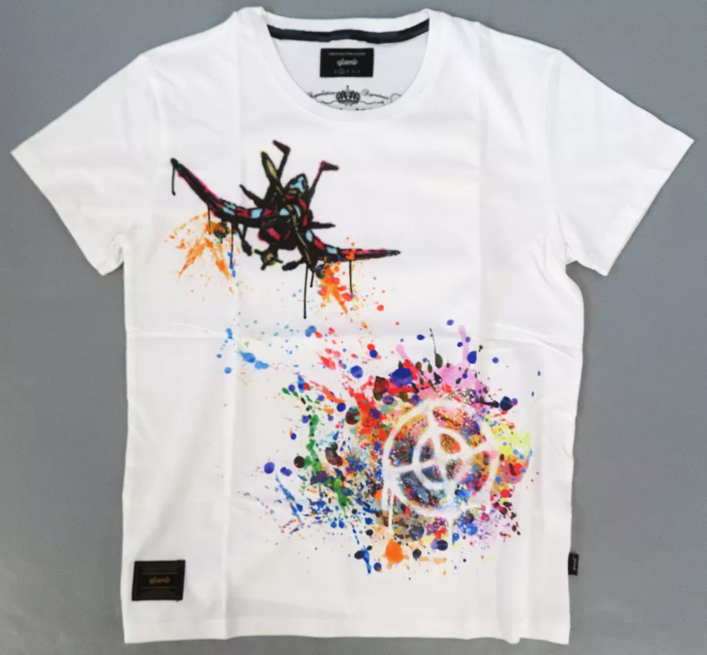 胸元には決め台詞「VOLARE VIA(飛んでいきな)」も配し、アイコニックなデザインを決定付けました。40/2天竺のテキスタイルで、リズム感あるグラフィックを軽やかに楽しんで。