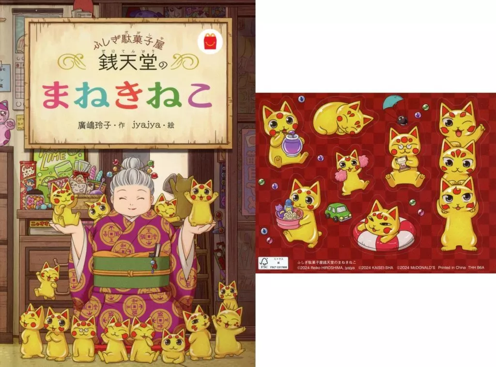 商品解説■2024年12月に販売されたハッピーセットです。あの大人気書籍「ふしぎ駄菓子屋 銭天堂」のまねきねこの絵本が、ハッピーセットに登場!魔法のお菓子を作っている、まねきねこたちの1日をマクドナルドオリジナルストーリー×さがし絵えほんでご紹介!とにかく、ねこがいっぱいにゃ!さがして、見つけて、わらって。まねきねこたちにまねかれて、えがおになってくださいにゃ!【商品詳細】付属品:シール作:廣嶋玲子絵:jyajya