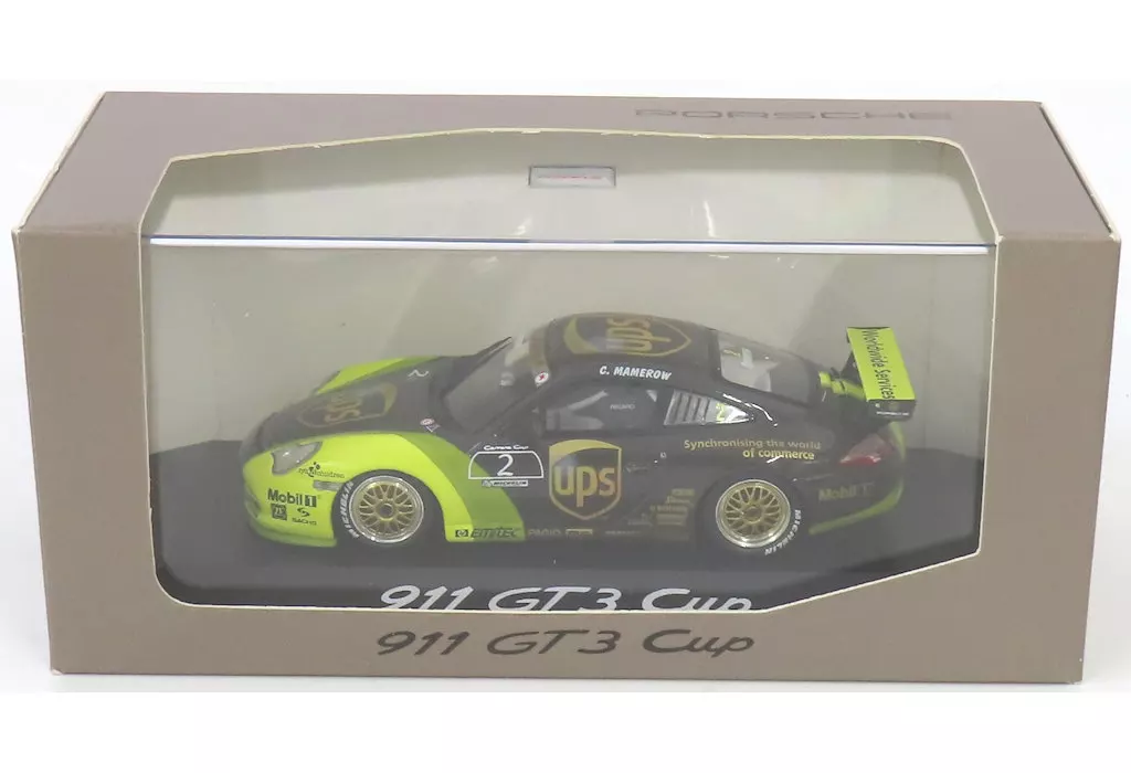 商品解説■PORSCHE 911 GT3 Cup #2(ブラック×ライトグリーン)が、1/43スケールのディスプレイモデルで登場です。車体にはUPSなどのロゴがデザインされています。車名が刻まれた専用台座とともにクリアケースに封入されています。【商品詳細】サイズ:全長約10cm