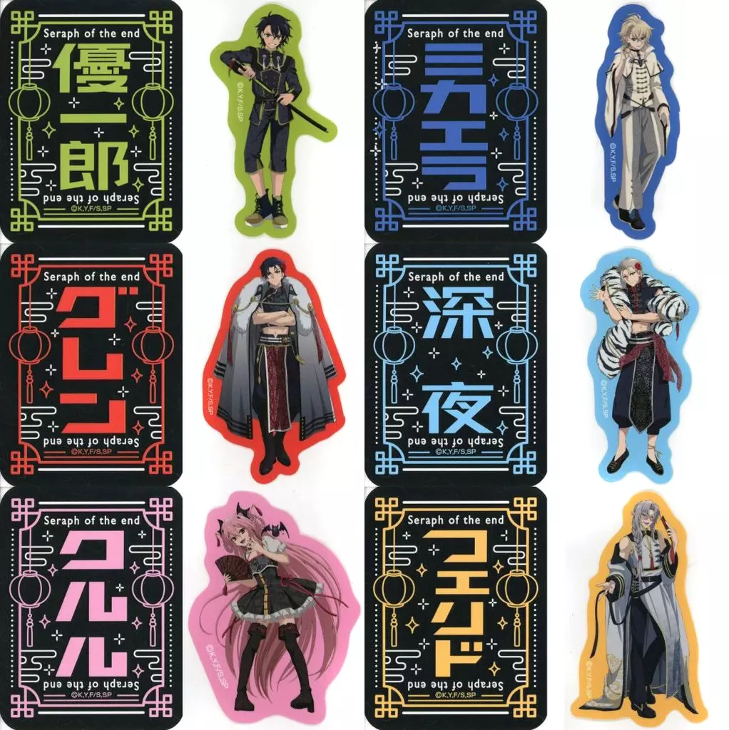 商品解説■こちらの商品は「終わりのセラフ POP UP SHOP 描き下ろしステッカーコレクション オリジナル衣装ver.」全6種セットになります。TVアニメ「終わりのセラフ」より、描き下ろしイラストを使用したステッカーコレクション【オリジナル衣装ver.】が登場!【商品詳細】<セット内容>百夜優一郎百夜ミカエラ一瀬グレン柊深夜クルル・ツェペシフェリド・バートリーサイズ:約H80mm×W60mm以内素材:紙、PP仕様:2枚入り