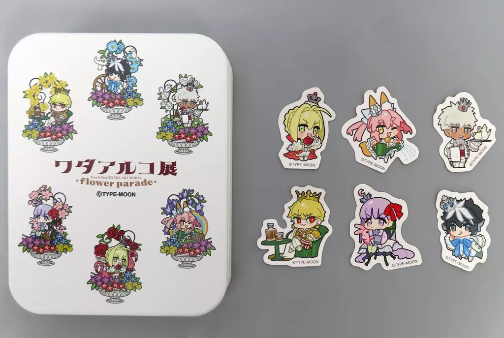 商品解説■「ワダアルコ展 Fate & Fate/EXTRA ART WORKS -flower parade- アンコール」のグッズです。【商品詳細】サイズ:約40×40mm(シール)/約95×122×20mm(缶)素材:紙、ブリキ仕様:フレークシール/6柄×3枚の全18枚入り