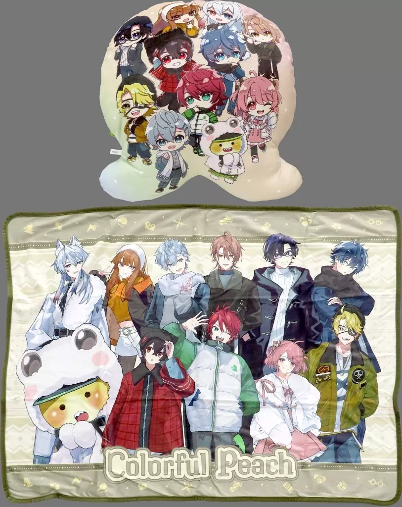 「一番くじオリジナル描きおろし」で、『カラフルピーチ』のメンバーが集合したビジュアルを楽しめるブランケットinクッションです。