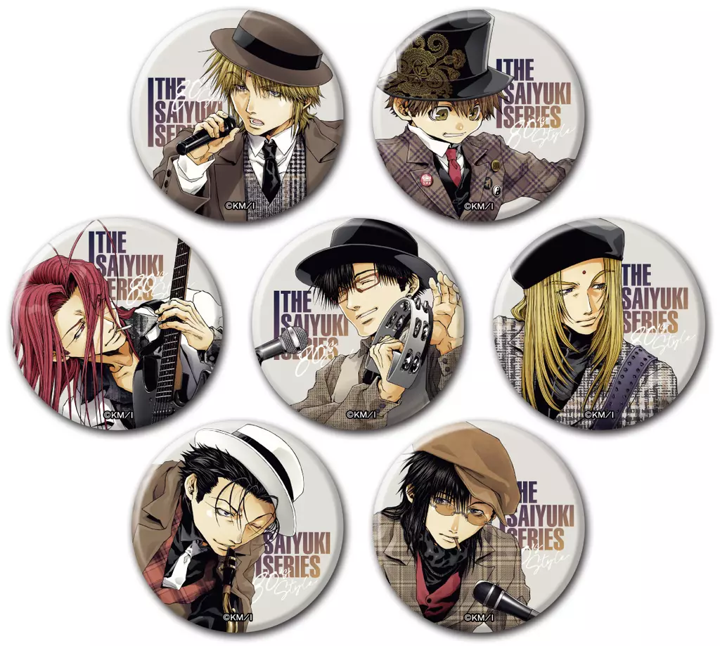 峰倉かずや先生が「バンド」をコンセプトに描き下ろされたイラストの玄奘三蔵、孫悟空、沙悟浄、猪八戒、金蝉童子、捲簾大将、天蓬元帥をマットな手触りの缶バッジに仕上げました。