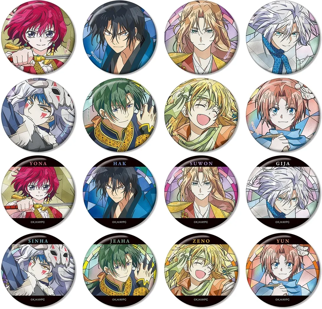 ヨナ、ハク、スウォン、キジャ、シンア、ジェハ、ゼノ、ユンのイラストを新たなタッチで魅力的に表現し、缶バッジに仕上げました。
