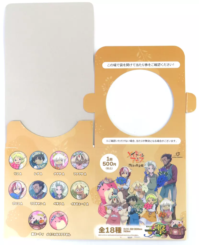 商品解説■「メイドインアビス 烈日の黄金郷 描き下ろし 花屋ver. 当たり付き一撃コレクション 75mmマット缶バッジ」の「くじ券BOX」です。【商品詳細】サイズ:約200×200mm
