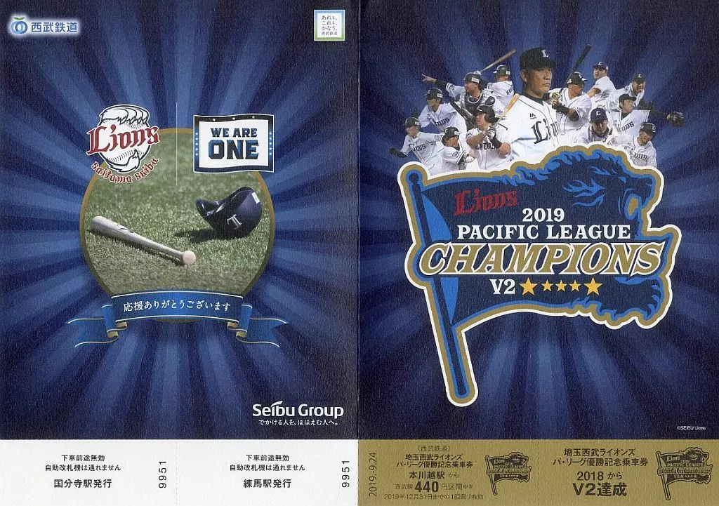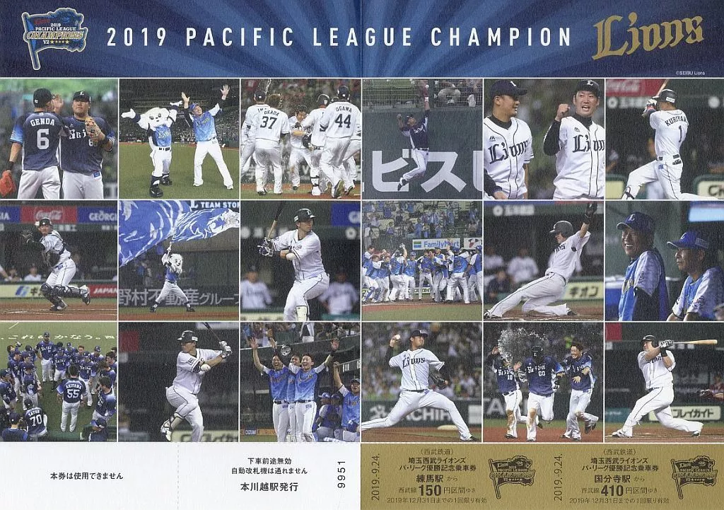 商品解説■埼玉西武ライオンズ 2019年パ・リーグ優勝記念乗車券です。<有効区間>練馬駅から150 円区間(大人・1枚)国分寺駅から410 円区間(大人・1枚)本川越駅から440 円区間(大人・1枚)【商品詳細】サイズ:台紙/折りたたみ時A5