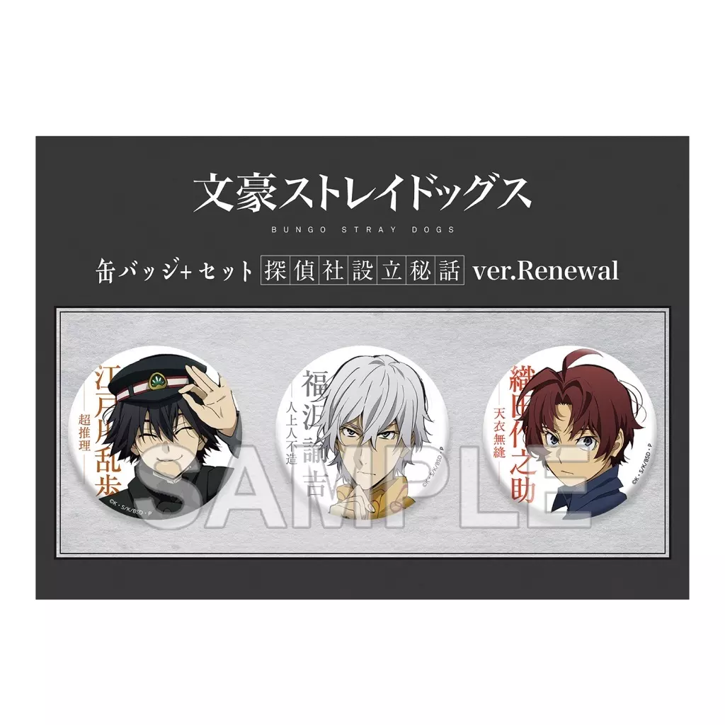 商品解説■アニメ「文豪ストレイドッグス」より、「探偵社設立秘話」に登場した江戸川乱歩、福沢諭吉、織田作之助の缶バッジセットが登場!コレクションするも良し、バッグなどに付けて使うも良しのアイテムです。※本商品はリニューアル商品のため、初版商品とはサイズや色味、材質が異なります。【商品詳細】仕様:3個入りサイズ:約直径56mm素材:紙、鉄、PET