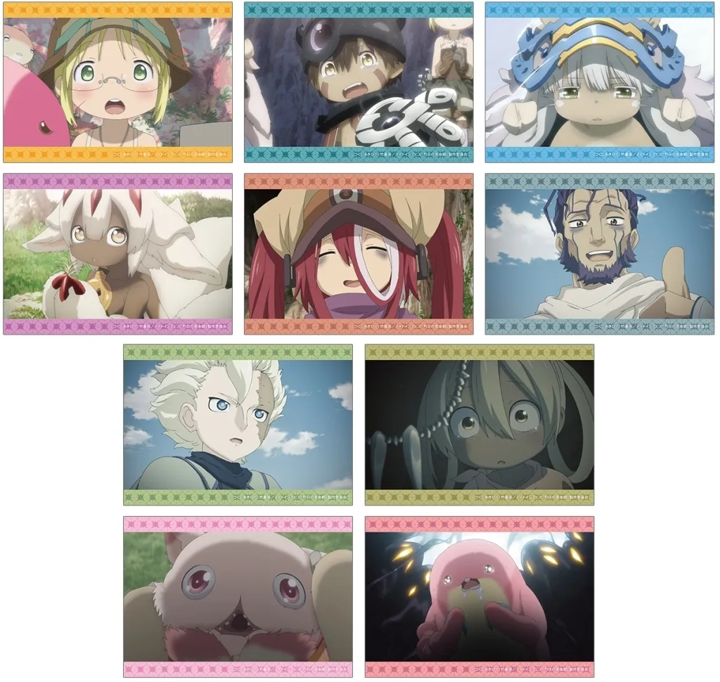 リコ、レグ、ナナチ、ファプタ、ヴエコ、ワズキャン、ベラフ、イルミューイ、壺ミーティ、マアアさんの印象的なシーンをブロマイドに仕上げました。