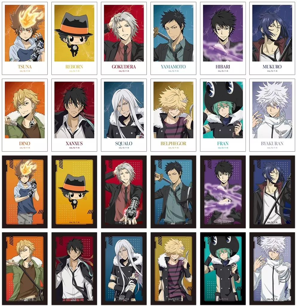 商品解説■TVアニメ 家庭教師ヒットマンREBORN!より、『描き下ろし 戦闘前ver. トレーディングイラストカード』の登場です。【商品詳細】全24種類サイズ:約80×50mm素材:紙<キャラクターラインナップ>沢田綱吉リボーン獄寺隼人(10年後)山本武(10年後)雲雀恭弥(10年後)六道骸(10年後)ディーノ(10年後)XANXUS(10年後)スペルビ・スクアーロ(10年後)ベルフェゴール(10年後)フラン白蘭