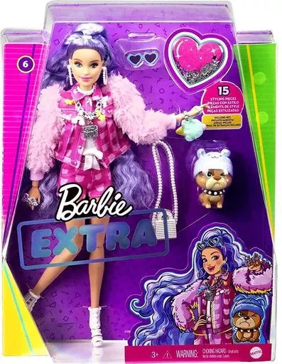 艶やかなブルーヘアにテディベアがプリントされたピンクのセットアップ&ジャケットをまとったファッショニスタなバービー。