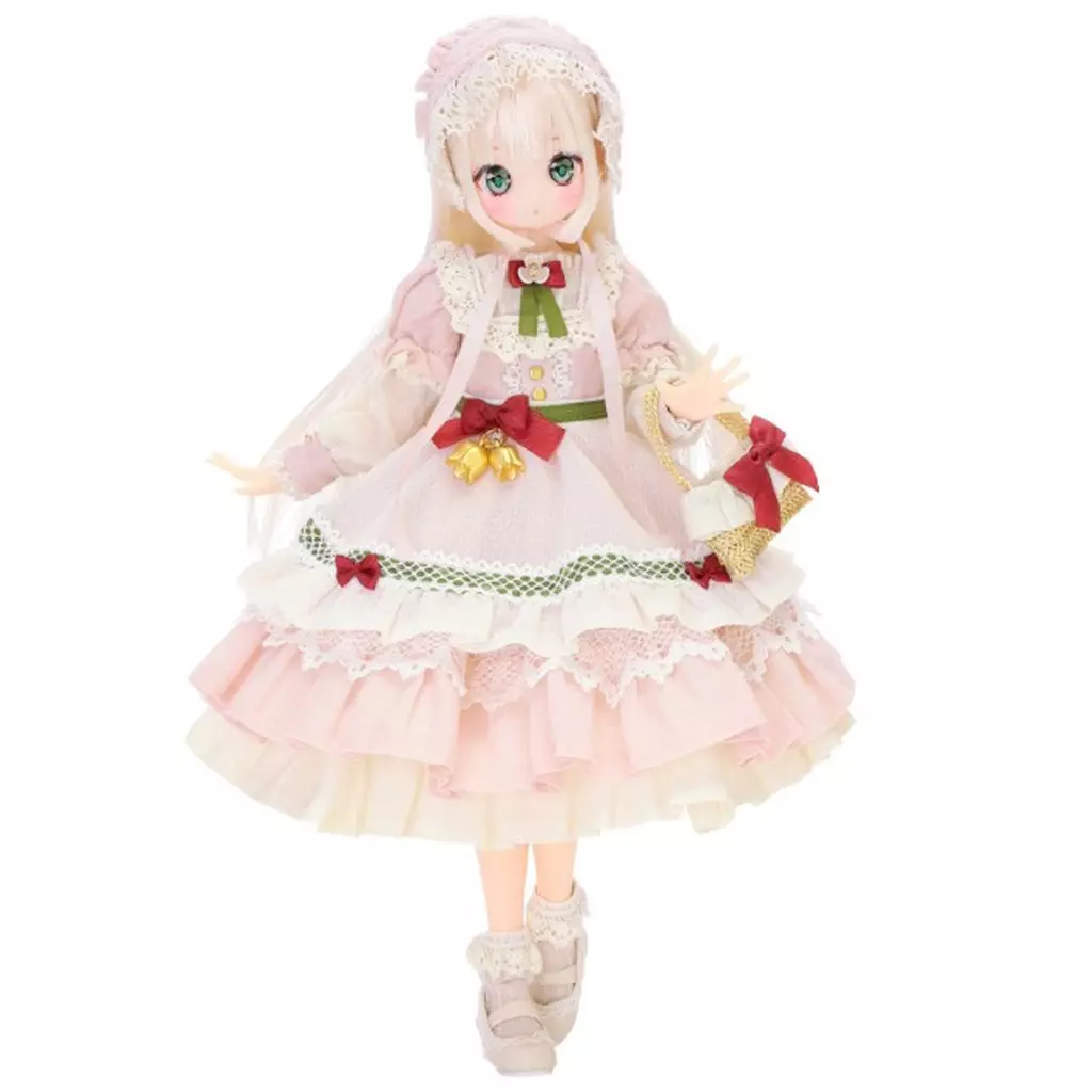 柔らかな若葉をイメージしたリーフグリーンの瞳。ヘアカラー、ワンピース、リボンはそれぞれ白・桃・紅の咲き誇る桃のカラー。