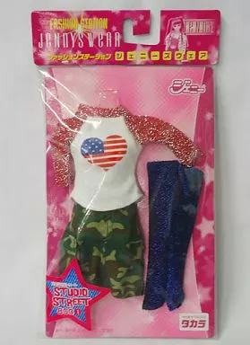 商品解説■「ファッションステーション ジェニーズウェア」シリーズに、No.1 スタジオストリート 衣装セットがラインナップ。長袖シャツ、半ズボン、靴下の衣装セットです。◆商品詳細セット内容:長袖シャツ(赤×白×銀)、半ズボン(迷彩)、靴下(黒×青)※商品にドールは付属しません。色・サイズ等ご注意ください。
