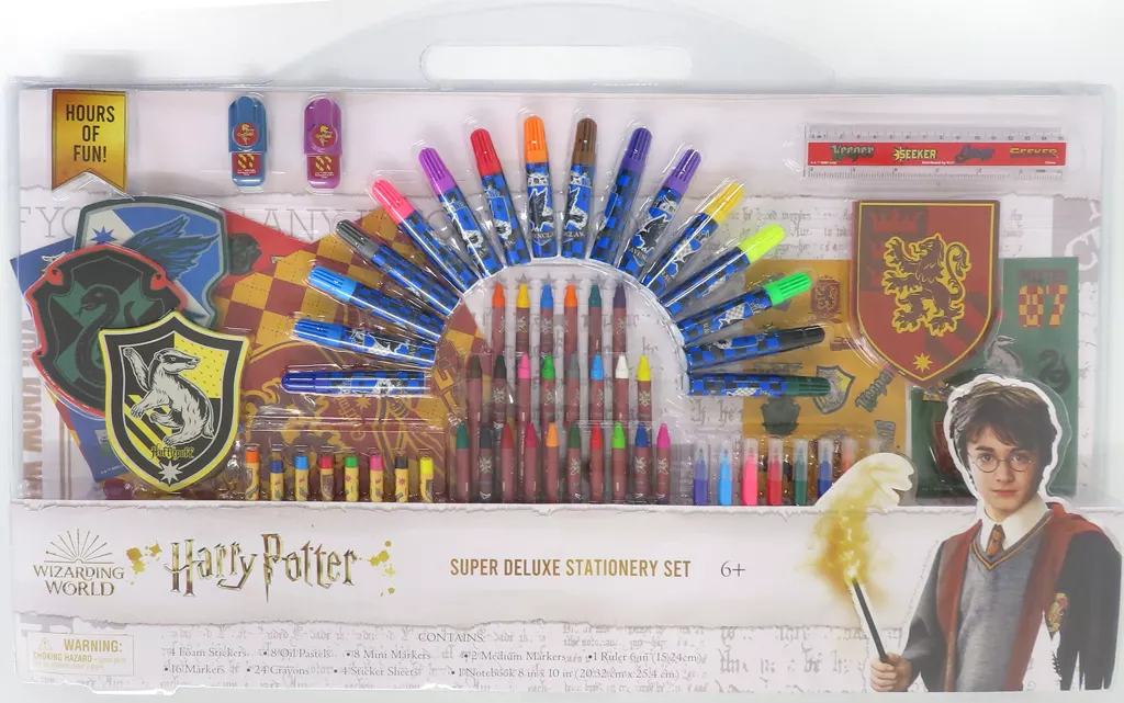 商品解説■「ハリー・ポッター」の公式グッズです。【商品詳細】<セット内容>寮章ステッカー4種オイルパステル8色ミニマーカー8色ミディアムマーカー2色定規(約15.24cm)マーカー16色クレヨン24色ステッカーシート4枚ノート(約20.32×25.4cm)サイズ:約W68×H38cm