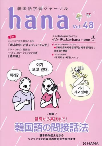 誌面の至る所に韓国語上達のための工夫が盛り込まれている『hana』は、本気で学ぶ読者から絶大な支持を得ています。特にNHK国際放送局の人気アナウンサー、イム・チュヒ氏が「癒し系」の声で収録したラジオプログラム形式の音声「hana+one」は本誌の最大の目玉コーナー。音声を繰り返し聞いて韓国語のリスニング力を鍛え、トラックごとにシャドーイングや音読などの練習を行うことで本物の実力を身に付けることができます。