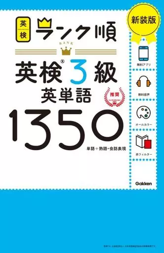 英語英検ランク順/英検3級の過去問を徹底分析し、単語・熟語と会話表現をランク順に並べた単語帳の決定版。よく出る例文や用法解説を掲載し、英検に「出る」使い方が効率よく覚えられる。単語学習アプリ、ダウンロード音声、赤フィルターつき。音声再生アプリ対応。